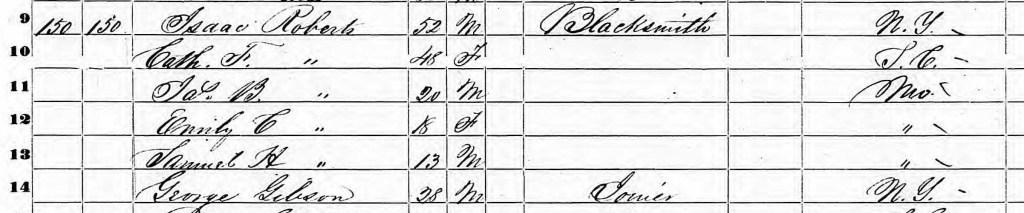 On December 9, the 1850 census was taken in Portland City, Washington County, Oregon Territory. The Roberts family lived in dwelling 150. Isaac is listed as a blacksmith. Here is a snippet of this record.